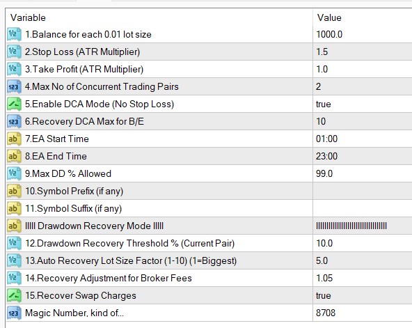 NB: the default settings will have no hard stop loss; if you need to have hard stop loss please disable setting 11; however we recommend using DCA mode with an equity-based stop loss on setting 15.