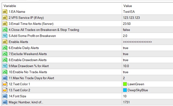 1. EA name: you can add the EA or strategy name so that this will be included in the emails.