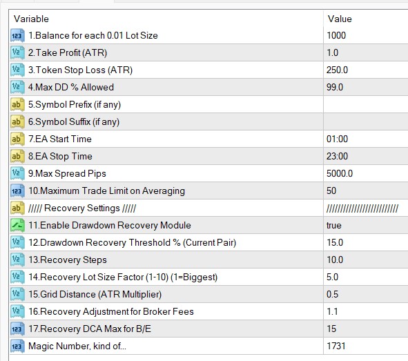 2.Token Stop Loss (ATR Multiplier) => You can set the SL as an ATR multiplier (Not in pips). We recommend you have a large hard stop loss which we do not expect to hit. This large stop loss level is simply to make sure the entries have some stop loss as some brokers would require some stop loss. This stop loss would largely serve as a formality. Our effective stop loss should be the drawdown based stop loss discussed in a later setting.