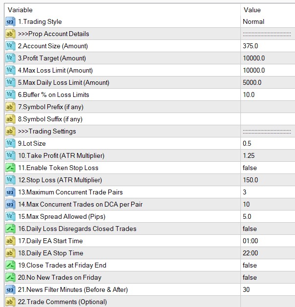 NB: Some prop firms might have a per-pair daily drawdown limit in addition to the overall account level drawdown limit. E.g. Overall daily drawdown is 5% but on a single pair, the daily drawdown limit is 2.5%. Our EA does not track drawdown on a pair level but only on an account level. In this case, a recommended approach would be using the lower drawdown limit (e.g. per-pair drawdown limit) as the account drawdown limit. In that case, we can further recommend you reduce the lot size also to a lower level (e.g. half of the normally recommended size).