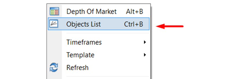 To check if the indicator signals are based on objects, just right click on any part on the chart and see if there is an item called “Objects List” as given below (this item will appear only if there are objects on the chart):